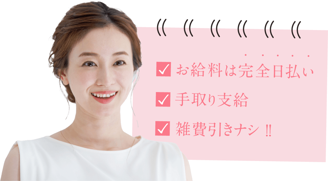 完全個室待機・ノルマなし・指名バックあり・全額日払い・無料研修制度・WワークOK・制服無料貸与・友達紹介手当あり・店泊可能・アリバイ会社有り